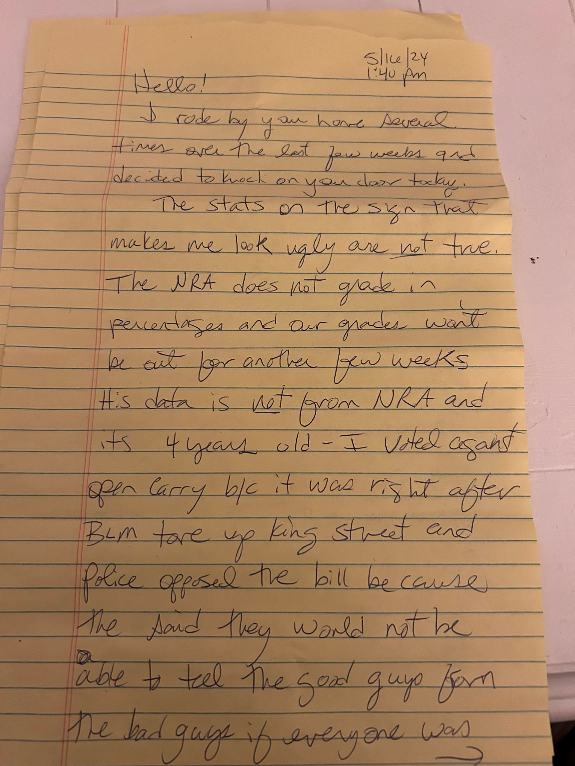 Sandy Senn repeatedly visits the home of a Matt Leber supporter, spending hours angrily scribbling out notes and trespassing on his driveway while his wife and young child were home alone. The homeowner had to leave work and return home because of Sandy Senn's repeated banging on his front door.